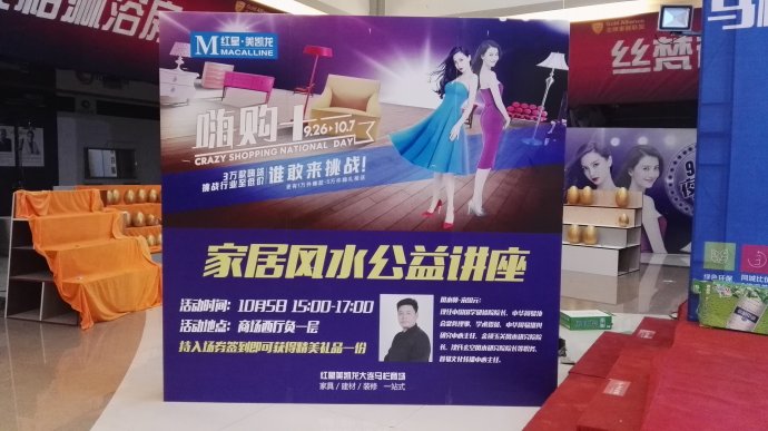 10月5日金玄风水创始人、金锁玉关风水实战研究专家、中国国学研修院院长、国际周易研究院常务院长、中华周易协会堪舆中心主任、首易文化传播中心主任-宋国元先生。应邀来到位于大连马栏南街52号的红星美凯龙开展一场高端风水讲座活动,这也是高端风水全国巡讲的第五场。此次活动是9月5日在辽宁省大连市甘井子区中华路的红星美凯龙华南店巡讲时反响强烈的表现。家居风水讲座的广告牌摆在了醒目的位置。