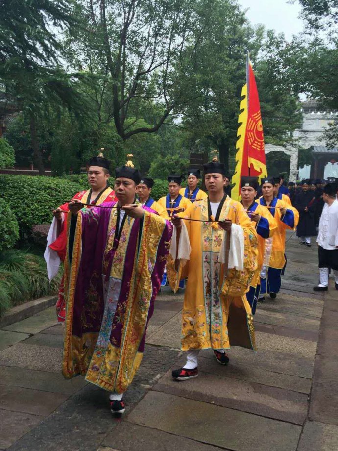 合影完毕,顿时鼓乐齐鸣,高功法师引众进入天师府授箓法坛