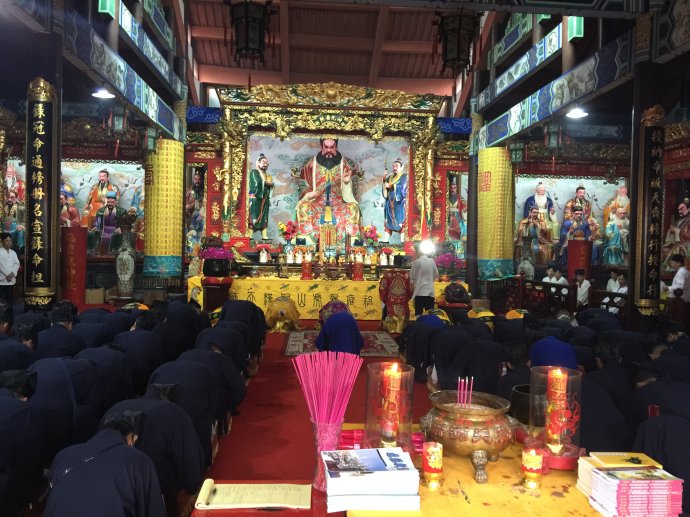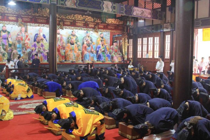 众弟子跟随天师府法务组参神谒祖,向三清祖师,诸神列圣,历代天师行三皈九拜大礼。
