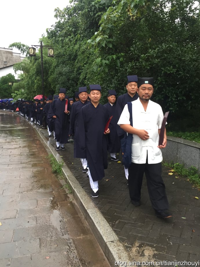 6月5日,法务组对受度弟子进行道教礼仪培训,6月6日上午当日,在宋罗元道长的引领下,众信士列队来到了天师府。天空一直下大雨,仿佛是天师对众信士的考验,也是送给信士们入道前最好的洗礼,信士们没有退步,反而更加坚定了步伐。在宋罗元、孙罗军、博明镜、王罗利及金玄弟子董霁萱、马淑文的带领下,冒雨排着整齐的队伍走向天师府。雨一直未停,但阻挡不了众信士求道的心,被雨水洗礼过的众师兄,更加的精神抖擞,来到嗣汉天师府门前。
